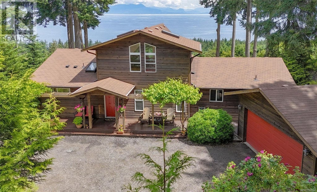 Take in spectacular ocean and mountain views from this thoughtfully designed West Coast–style home! The main level features a spacious living room with vaulted ceilings, wood floors, and a full wall of windows that frame the ever-changing scenery—where sky and sea shift with the light. A three-sided propane fireplace provides a warm transition between the living and dining areas, while the kitchen offers granite countertops and a functional layout. Nearby, you'll find a small office nook, a full bathroom, laundry area, and two bedrooms—including the primary suite, which opens onto a covered deck and features a 4-piece ensuite with a beautiful soaker tub. Multiple doors lead to the new composite deck with sleek glass panels and aluminum railings—an ideal place to enjoy the expansive, maintainable view. Upstairs, the open loft offers a flexible space for a studio, library, or home office. The lower level includes a spacious bedroom with its own entrance, a 4-piece bathroom, and a large unfinished area with endless possibilities. Outside, you'll find inviting garden pathways and seating areas that make the most of the panoramic setting. A detached double garage, new water pump, and generator, well and cistern add to the functionality of this exceptional coastal property. (id:6289)