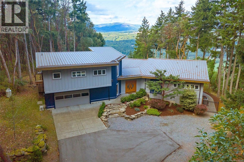 Welcome to this stunning & secluded home nestled in the heart of Aquilla Estates. Surrounded by mature trees & nature w/ breathtaking harbour & mountain views. This 5-acre property offers the perfect balance of peaceful country living & convenient access—just a short drive to both Ladysmith & Nanaimo. This modern custom home features a smart layout designed for easy main-level living. The spacious primary suite & a 2nd bedroom are on the main floor, while a third bedroom w/ ensuite & a private deck is located upstairs—ideal for guests or a family room. Enjoy cinematic experiences in the soundproof, high-end media room. Step outside of the main living area to a natural, low-maintenance yard & take in the tranquil setting—perfect for your morning coffee or evening unwinding. Additional features include a large laundry room w/ built-in dog wash, & a full-height walk-in crawl space offering extensive storage. A rare opportunity to embrace the best of West Coast living in comfort & privacy. (id:6289)