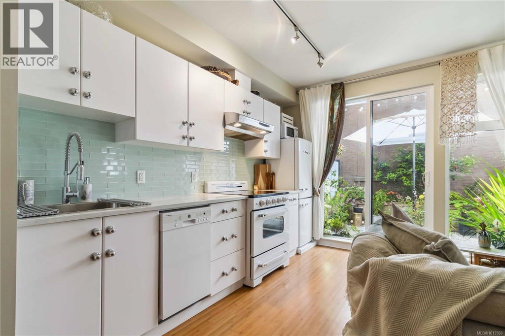 Discover your perfect, very private, downtown retreat in the vibrant core of Victoria! This stylish ground-floor garden junior 1-bedroom condo features a rare 169 sq ft fully fenced courtyard—ideal for pets, morning coffee, or entertaining under the city sky. With room for loungers, plants, or dining al fresco, it's your outdoor escape in the heart of it all. Housed in a beautifully restored heritage conversion, the building offers charm and modern urban convenience. Inside, enjoy bright, sun-filled living with large south-facing windows that bring the space to life. The open layout includes a sleek kitchen with brand-new high-end retro appliances & modern countertops. The living space offers room to relax, dine, and sleep with a clever pony wall for separation. You’ll love the added perks of in-suite laundry, a storage locker & secure bike storage in this like-new, very well-managed building. Just steps to restaurants, shops, cafes & the Inner Harbour - call today! (id:6289)
