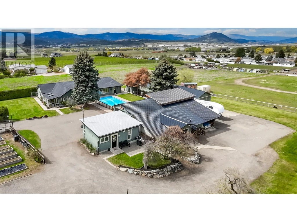 Rural paradise; a legacy acreage. 1.15 acre corner lot, outside of the ALR in the quiet Ellison community. Lovingly updated home with versatile floor plan - a total of 4 bedrooms and three bathrooms that can be used as one large home or a main home and a two bedroom suite. The bright and spacious living room/dining room is the heart of the home, with a cozy gas fireplace and a perimeter of windows with mountain views. A galley kitchen with direct access to the sunroom and a generous laundry/ full bathroom complete the main floor. The suite wing of the home has another spacious living area, dining room or office, summer kitchen and complete laundry. Loads of storage space in the basement including a large pantry area. Outside, the living space continues. A concrete, in-ground pool is the centrepiece of the courtyard. Enjoy amazing sunsets with mountain view from the party-sized, covered, raised deck. Irrigated, lush landscaping surrounds the buildings on the property including large grassy areas, fruit trees, and a large garden with raised boxes. Detached one bedroom suite with its own driveway and outdoor space. Perfect for a nanny, student, granny or short-term rentals. HUGE shop perfect for a home based business, or the weekend hobbyist. 3-phase power available. Walking distance to Ellison Elementary School. (id:6289)