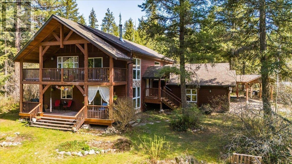 Spacious and versatile, this 1.12-acre property offers a beautiful 3000 sq ft home with attached garage surrounded by mature trees, gardens, both wild and domestic perennial fruit and trees, with peekaboo mountain views. The main floor features a custom concrete-counter kitchen, large pantry/laundry, dining room with access to a West Facing- covered deck, plus an office, media room, large mudroom, storage/utility room, and a half bath. Upstairs you'll find a cozy living room with wood stove and covered deck, vaulted ceilings, cork and wood floors, a large primary bedroom with walk-in closet, built-in shelving, a full ensuite, plus three more bedrooms, a flex space and a full bathroom. Efficient heat pump and low e windows throughout bring in abundant natural light. A detached carport offers more covered parking. Bonus: a well-kept 2-bedroom mobile home (14x68 ft) with new roof and windows provides rental income. This home is tucked away on a private flat lot a short walk to downtown Winlaw BC. (id:6289)