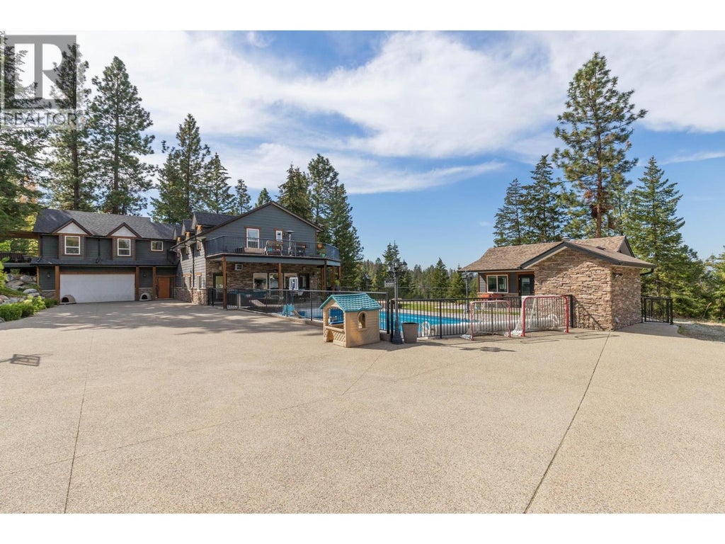 Welcome to this exceptional 9.9 acre property in sought after South East Kelowna, featuring a 3,600+ sq ft home, detached 4 car garage, pool, and more. The lower level offers a welcoming foyer, double garage, spacious family room with fireplace, one bedroom, full bathroom, and access to a large patio. Upstairs, the family friendly floor plan includes a primary bedroom wing with walk-in closet and private ensuite, plus two additional bedrooms with a shared full bath. The open concept kitchen and living area boast vaulted ceilings, stainless steel appliances, marble countertops, and access to a wrap around balcony with stunning lake, city, and valley views. Outdoor living is a dream with an expansive in-ground pool, concrete deck, and a pool house complete with kitchen, full bathroom, and guest accommodations— ideal for inlaws, visitors, or short term rental opportunities. A large gym space adds to the versatility of this property. The 9.9 acres offer privacy, elbow room, and ample space for children, pets, and recreational parking. A charming creek runs through the property, enhancing the peaceful setting. This is a rare opportunity to own nearly 10 acres in South East Kelowna with a spacious home, detached garage/workshop, pool, guest quarters, gym, and panoramic views. (id:6289)