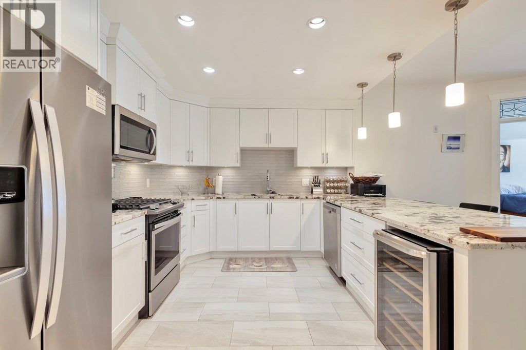 Welcome to Waters Edge offering luxury living just steps from the water. Inside this 2 bed, 2 bath, 1356 sq ft condo, every detail is designed to impress. High ceilings and an open concept layout make the home feel spacious and inviting, while rich hardwood floors and a stone gas fireplace add warmth and charm. Designed with a thoughtful split floor plan perfect for empty nesters seeking privacy or lock-and-leave convenience.The chef’s kitchen is a dream with shaker-style cabinetry, granite counters, stainless appliances, large island and a bonus wine fridge, perfect for hosting. Retreat to the large master suite with its spa-like ensuite featuring a glass shower and double-sink vanity. Re-Built new in 2021, you get timeless square footage paired with modern luxury. Step outside to a huge deck ideal for BBQs and family dinners, plus enjoy unbeatable strata perks with a very affordable fee with a pool, hot tub, gym, putting green, and more. Backing onto the canal and steps to the beach, Pandosy Village just outside your door, this is Okanagan living at its finest. Don’t wait - book your showing today and secure your piece of paradise. (id:6289)