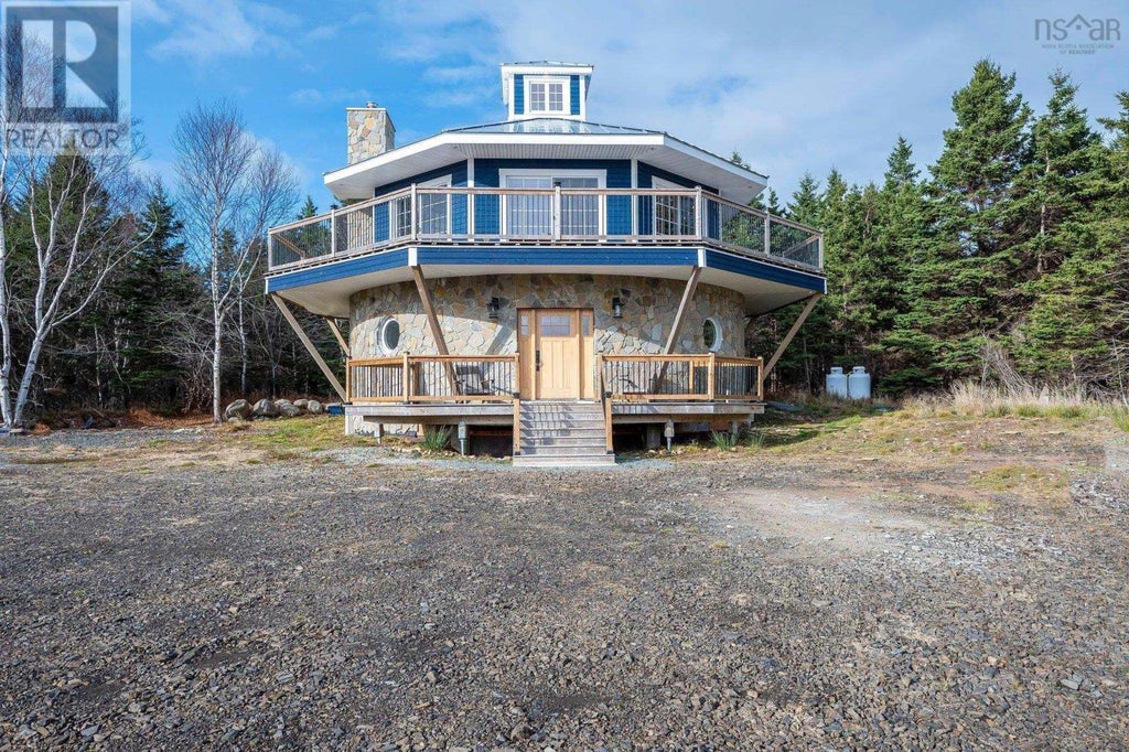 Welcome to "Blue Lighthouse," a charming and hurricane-safe retreat near historic Lunenburg, Nova Scotia, and just a short deeded path to the ocean. Elevated above the coastline, this unique octagonal home offers the beauty of seaside living without direct waterfront risks, with ocean access only a 3-minute stroll away. Completed in 2024, this one-of-a-kind home features an open-concept layout with a cozy stone fireplace, a gourmet kitchen with a six-burner range, and handcrafted cabinetry. The character shines through with oversized porthole windows and a lighthouse-inspired peak. The primary suite boasts an ensuite with laundry access. Designed for year-round comfort with underground electrical and a durable metal roof, the wraparound deck provides panoramic views. Priced below the cost to build, the seller never got to live in this dream home, but now it's your chance. An adventurous cottage or unique homeit's up to you! (id:6289)