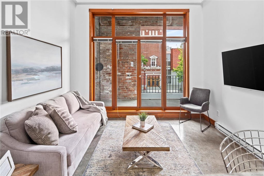 Trendy loft style living, great downtown location. The “Kinemacolour” registered heritage building offers unique work/live spaces, where you can legally operate your business out of your home. Located across from McPherson theatre, and close to the entrance of Canada’s historic first china town. Unit 204: Currently tenanted, photos are from another similar unit. The layout is very alike with different heritage elements throughout and different sizes. You need to come see these in person to fully appreciate all they have to offer. Contact list agent for more details and showings, 24 hours notice required to show. This is a three level townhome with two open concept bedrooms, and two enclosed bathrooms (3 Piece & 2 Piece). The gated alleyway secures the private entrances for each of the nine residential units. The entrance of unit 204 leads up a set of stairs to the Dining/office area, and up to the private west facing balcony overlooking the alley. Continue through the main level to the open concept kitchen/living area where exposed brick and a stylish rounded window overlooking government st. highlights the room. Large skylights fill the home with natural light. Tastefully incorporated heritage elements of original brick throughout. Up the main stairs you will reach a landing with the main bathroom continue past the landing to the main bedroom, up the stairs on the other side of the landing is the upper/secondary bedroom which overlooks the living space which boasts a max ceiling height of 20ft. In unit stacked laundry, and lots of storage. Additional storage locker provided, low strata fees (305.14). Parking not supplied, street parking available. All Measurements are approximate. Buyer to verify all info deemed necessary. Photos have been virtually staged. Kelvin Doore Engel & Völkers Vancouver Island Phone: (778) 433-8885 Email: kelvin.doore@evrealestate.com (id:6289)