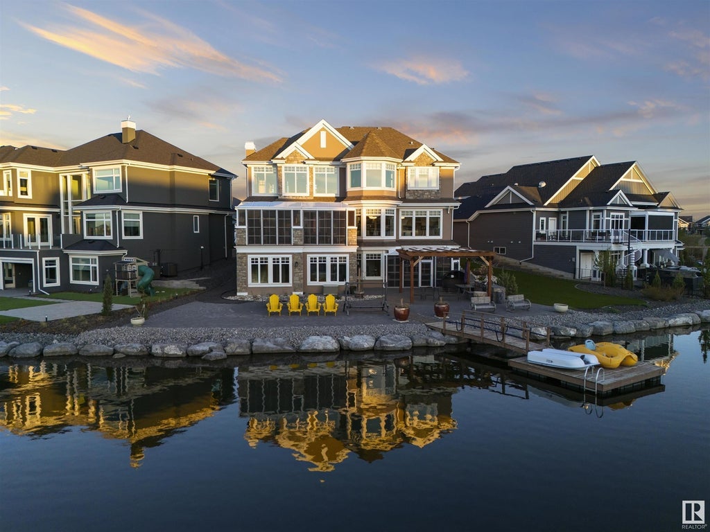 Welcome to a true lakefront masterpiece in Summerside. Set on the most coveted lot on the water, this one-of-a-kind estate offers over 6000 SF of finished living space designed for unforgettable living and entertaining. Inside, you’re welcomed by soaring ceilings, a sun-filled open layout, and elegant finishes throughout. The heart of the home features a dream kitchen, a stunning living room, and a formal dining space that seats 16. Step outside to a resort-style, low-maintenance backyard with synthetic turf, a pergola-covered lounge, multiple dining zones, and a private dock leading to Summerside Lake. Year-round enjoyment awaits with your indoor pool and hot tub, glass-enclosed sunroom, solar panels, elevator, and a massive triple garage. Whether it’s morning coffee with lake views or summer nights under the stars, this home delivers the lifestyle most only dream of. Imagine the possibilities of life on the lake, within the city. (id:6289)