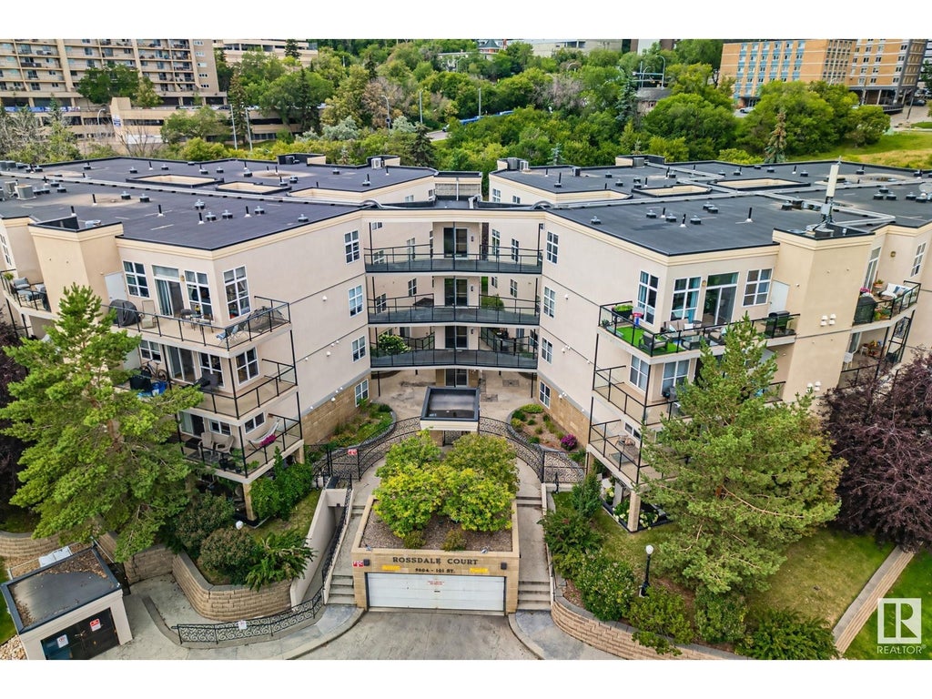 Stunning top floor corner unit in Rossdale Court with panoramic River Valley and downtown views. This 2 bed, 2 bath home is flooded with natural light thanks to 10’ ceilings, floor-to-ceiling windows, and an open-concept layout. Extensive upgrades include hand-scraped hickory hardwood flooring, a custom kitchen with granite counters and induction cooktop, plus a newer furnace, hot water tank, and air conditioning unit. The spacious primary suite features a walk-in closet and full ensuite. Enjoy morning coffee or evening wine on the wraparound east/south-facing balcony with exceptional privacy and sun exposure. Located on a quiet street just steps to the downtown core and River Valley trails. Comes with underground parking, storage, and a proactive condo board with a healthy reserve fund. Truly one of the best locations and layouts available—this is elevated city living at its finest. (id:6289)