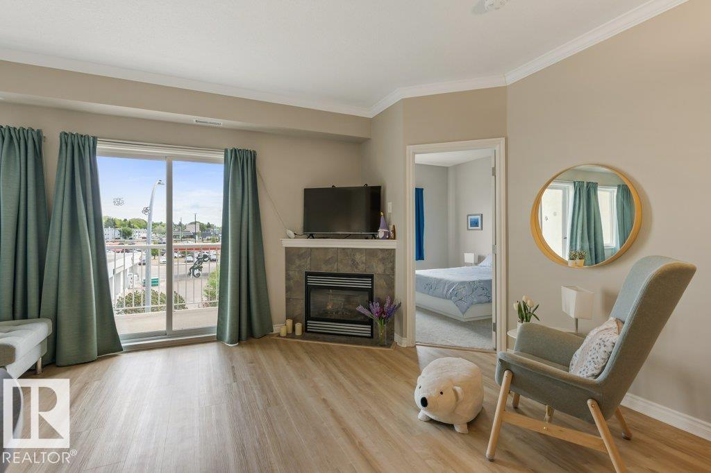 Welcome to this beautifully refreshed 45+ adult living condo on the third floor! This unit boasts stunning new luxury vinyl flooring and calming, freshly painted natural tones throughout. The roomy one-bedroom layout includes a versatile den, two bathrooms, a convenient walk-through closet, and in-suite laundry. Enjoy the cozy corner gas fireplace and a functional kitchen complete with an eating bar. The spacious, east-facing covered balcony, equipped with a gas hookup for your BBQ, is perfect for morning coffee or relaxing evenings. This unit comes with one underground parking stall, a secure storage cage, and access to a car wash bay, guest suite, and social room. The incredible location offers unparalleled convenience, situated next to Bonnie Doon Mall, public transit, and the vibrant Whyte Avenue—everything you need is truly at your doorstep! (id:6289)