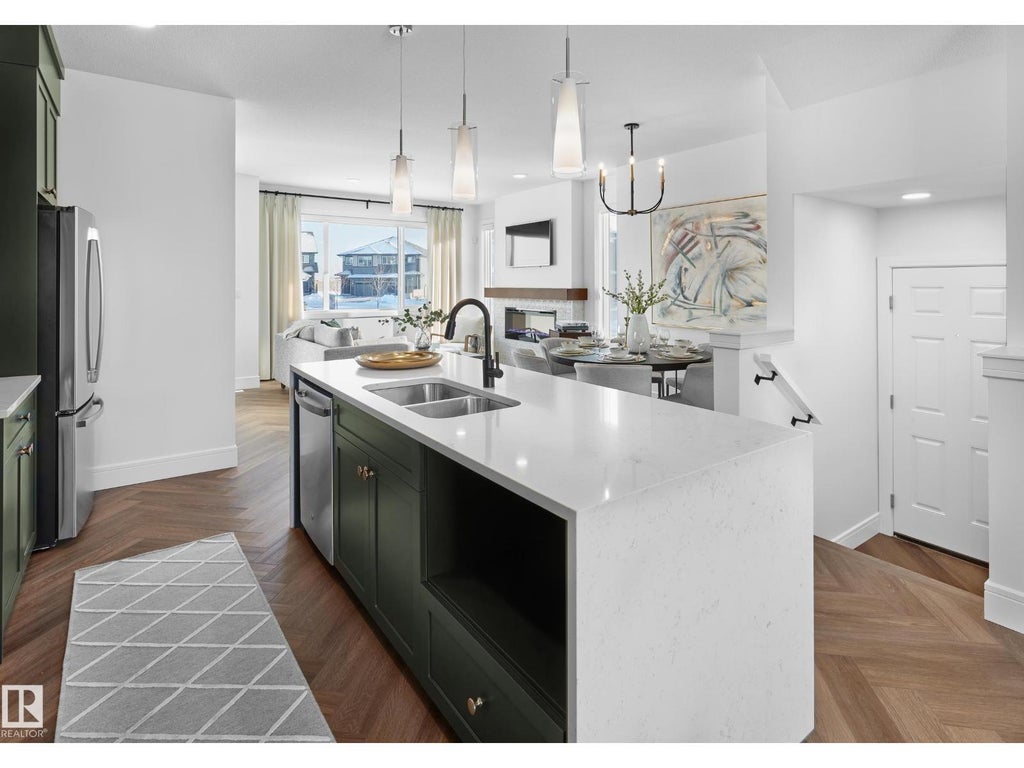 **SHOWHOME for SALE** All window coverings, Wall Art and a 20x20 GARAGE included. Welcome to the Asher, where functionality meets modern living. This current showhome has been thoughtfully upgraded with the most luxuriest upgrades including herringbone vinyl plant install and moden railing throughout. This thoughtfully designed home combines style and functionality with a side entrance ready for future basement development. The kitchen features a chimney hood fan and beautiful upgraded cabinetry. This home also has two beautiful living spaces on the main floor and a large dining area. It is located on a CORNER LOT with extra windows and a landscaped front yard with a rear deck already built. The Orchards is a vibrant, family-friendly community in southeast Edmonton, this home provides access to an abundance of parks, ponds, and walking trails. Residents also enjoy exclusive access to a private 8-acre clubhouse featuring amenities for all ages, including a spray park, NHL-sized skating rink, & playground (id:6289)