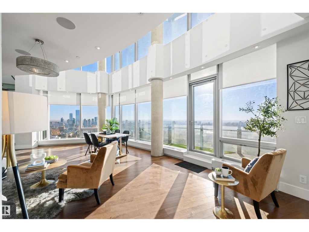 Perched high above the city, this ultra-luxury 3,415 sq. ft. sub-penthouse in the Pearl Tower is a rare masterpiece of design and craftsmanship. Wrapped in floor-to-ceiling glass, it showcases panoramic views in three directions, including a breathtaking south-facing view over the river valley and golf course. A mesmerizing Bocci chandelier cascades from 20-foot vaulted ceilings, filling the space with a custom, artistic glow. The European kitchen is a chef’s dream, with 10 Gaggenau appliances valued over $150,000, motorized cabinetry, LED lighting, and walnut dividers. Solid American walnut doors, floors, and stair treads highlight the home’s exceptional detailing. The primary suite is a private retreat, offering a no-expense-spared ensuite with Italian Carrera marble, a two-person shower, and a freestanding tub overlooking the skyline. With 4 bedrooms, 4 balconies, 4 parking stalls, and 24-hour concierge and security, this home defines elevated living. (id:6289)