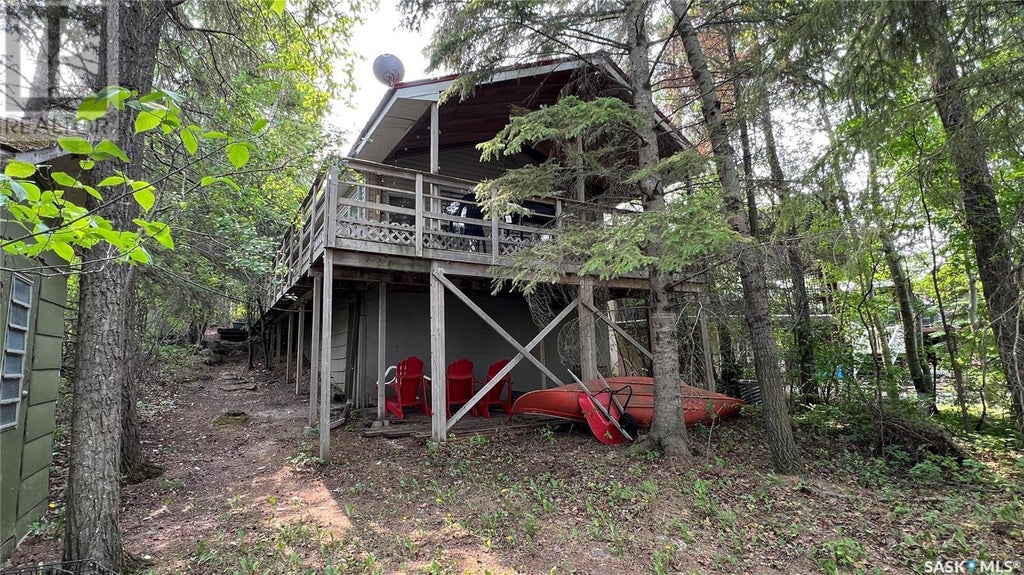 Lakefront Oleksyn Beach, very private heavily treed with spruce and pine trees. 3 bedroom 976sq' Modified mobile home with additions including a metal roof & newer siding. The kitchen features an eating nook, wood cabinets, and an open living dining area complemented by a wood fireplace. Screened sunroom, porch, all appliances (new washer), and furnishings are included with the purchase. Only the seller's personal items will be removed. The front door opens to a large covered deck that wraps around the east side of the cottage. nat.gas BBQ hook-up, plus sheds and a single detached garage on the leased utility lot behind the property until 2034. Also included in the purchase price are a water trailer and a portable 250-gallon water hauling tank, plus an added bonus a 3000lb boat lift with aluminum dock system. 1000-gallon septic tank, 700-gallon cistern. This is an ideal location with great year-round access off Highway 41. The Golf course is just across the lake! Only 50 minutes from Saskatoon. (id:6289)