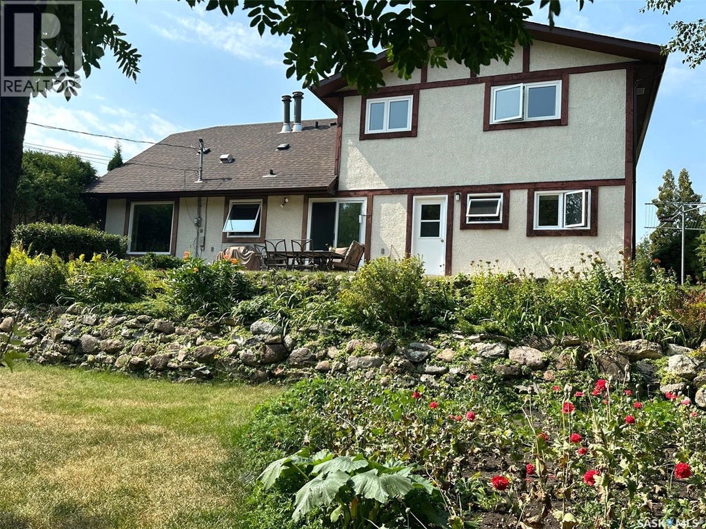 Welcome to 706 Donald Street, a spacious and inviting 5-bedroom, 4-bathroom home nestled within town limits yet surrounded by nature. The exterior offers a beautifully landscaped yard with rock retaining walls covered by cascading perennials. Mature trees and natural growth provide privacy, while the backyard features a garden space and two sheds for additional storage. This property backs onto the east forest, offering peaceful views and a sense of seclusion. Inside, the upper level includes four bedrooms and two full bathrooms, with one room currently serving as a office. The main level has been recently updated with vinyl plank flooring in the living room and formal dining area, and a walk-in shower has been added to the back entrance, transforming it into a convenient three-piece bath. A patio door off the breakfast nook leads to a large patio that overlooks the backyard. The home is equipped with central air conditioning for year-round comfort. The finished lower level includes a guest bedroom, a craft or workroom, a sewing room, and a laundry area, along with ample space for entertaining. A truly unique shower stall with stained glass mosaic. An attached two-car garage adds convenience, and the original build features two inches of styrofoam under the stucco and R60 insulation in the attic, contributing to impressive energy efficiency as reflected in the utility bills. This well-maintained home is ready for its new owners—call or text today to schedule your private viewing. (id:6289)